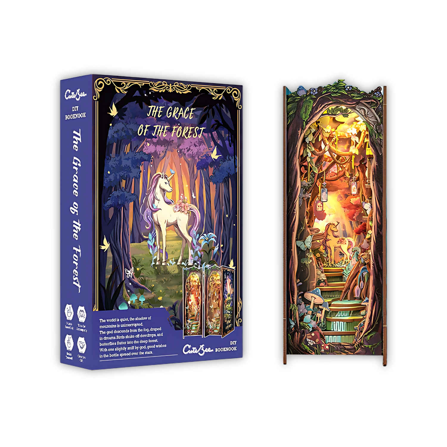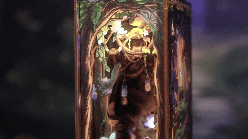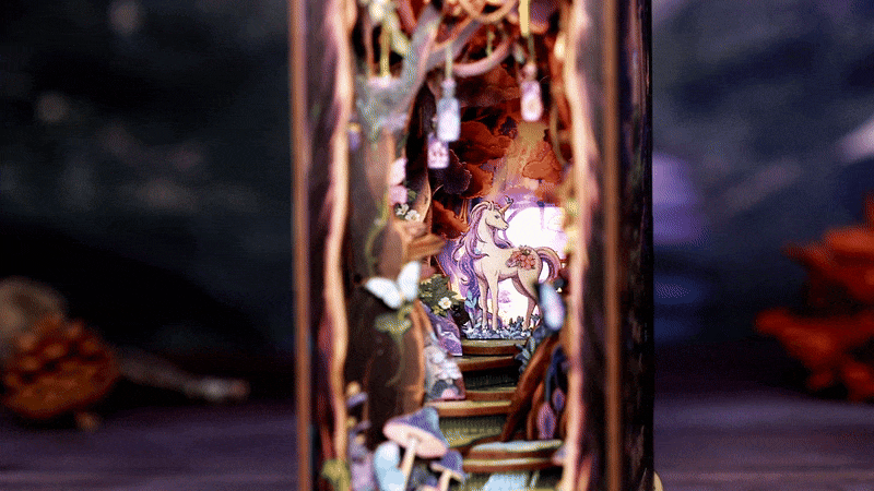 Plongez dans un univers féerique avec ce Book Nook Grace of the Forest, une scène miniature où la nature et la magie s'entrelacent. Entre champignons colorés, vignes fleuries et licorne mystique, chaque détail évoque la paix, la chance et la beauté d'une forêt enchantée. Idéal pour embellir votre bibliothèque et vous offrir une pause poétique à chaque regard.