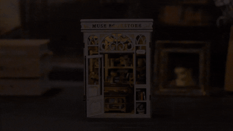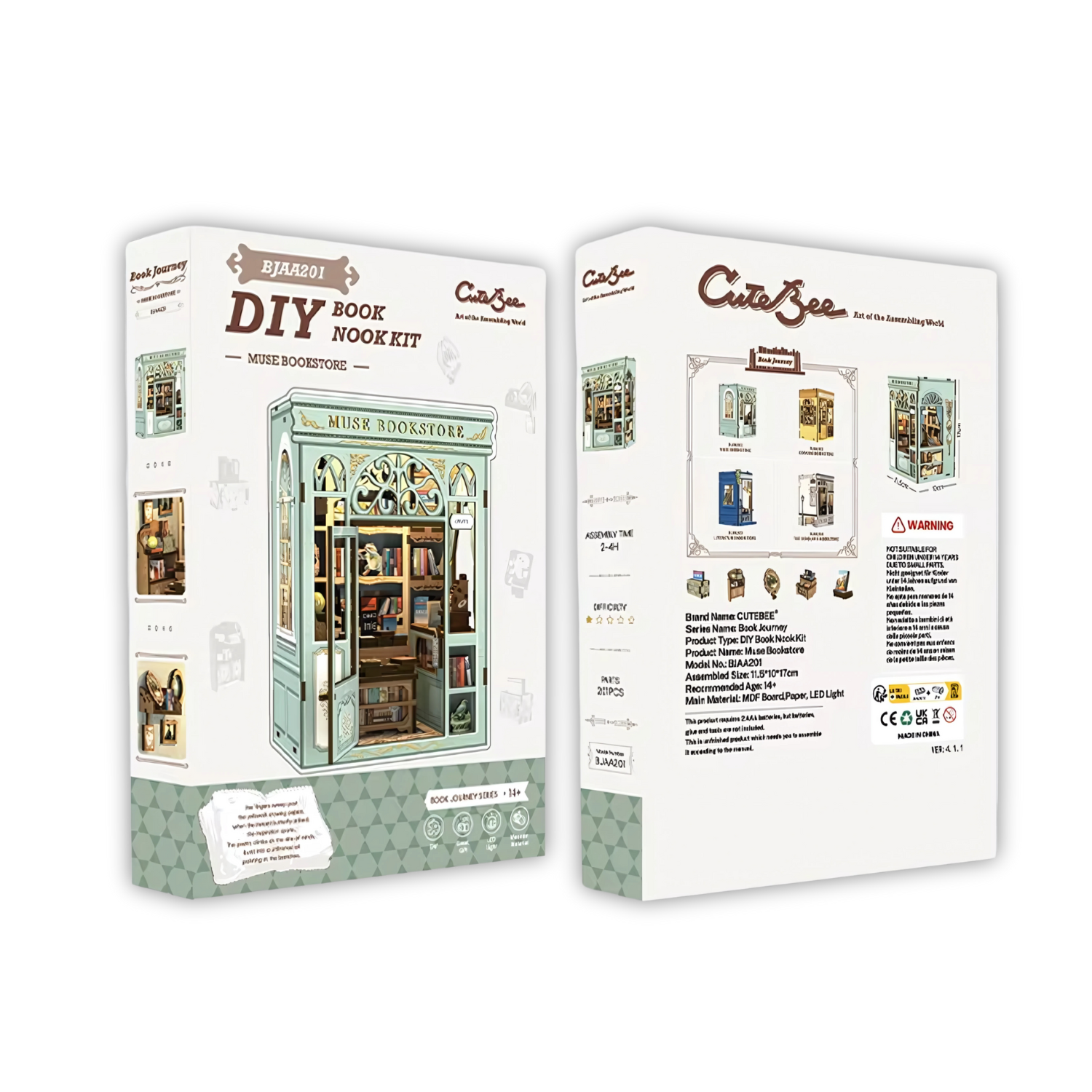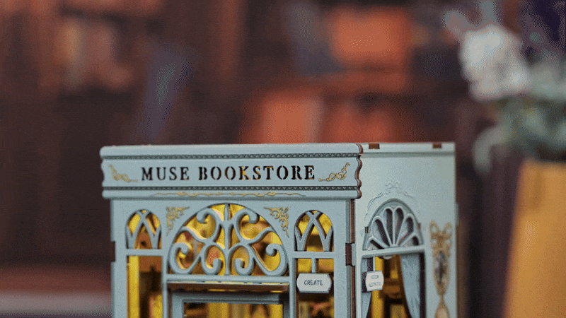 Assemblez une librairie miniature lumineuse et inspirante avec le Book Nook Muse Bookstore. Ce kit DIY en bois de 201 pièces révèle un espace paisible dédié à la lecture, baigné d'une douce lumière naturelle simulée par son éclairage LED intégré. Idéal pour se détendre, décorer ou offrir en cadeau.
