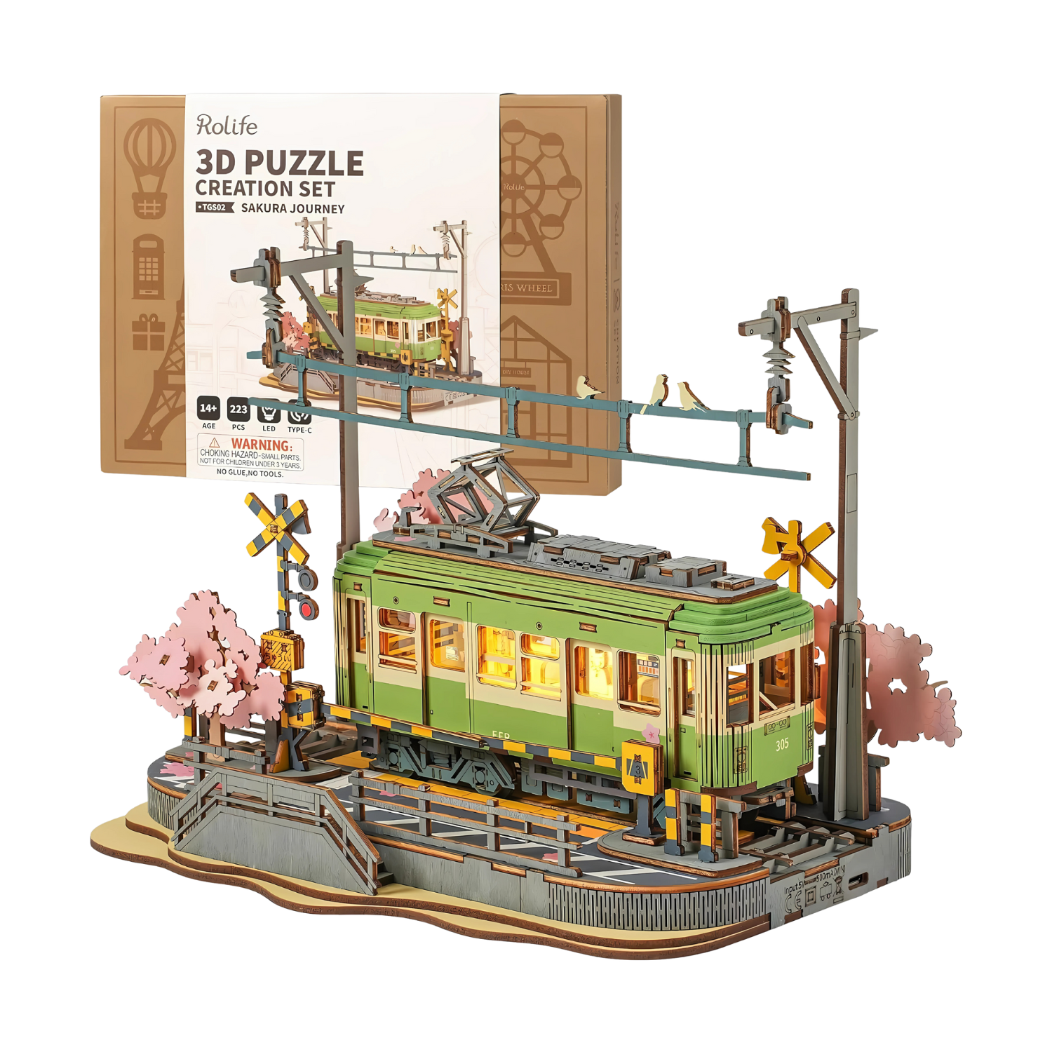 Découvrez le Sakura Journey - Tram, un puzzle 3D en bois inspiré des tramways traditionnels au cœur d’un paysage fleuri de cerisiers. Son assemblage précis et son éclairage LED en font une pièce à la fois décorative et immersive.